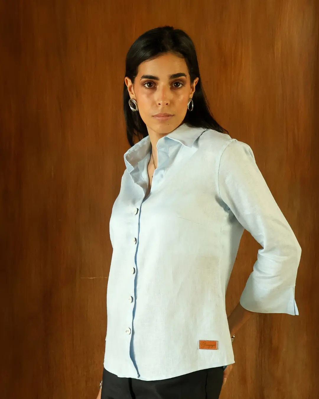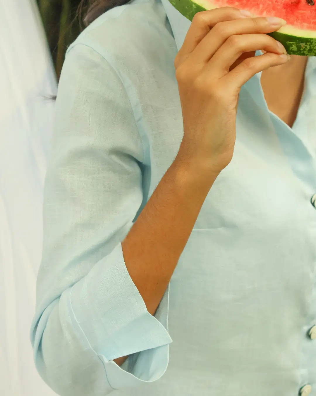 Camisa de 100% lino con pinzas en busto y espalda para resaltar cintura y dar una forma femenina.