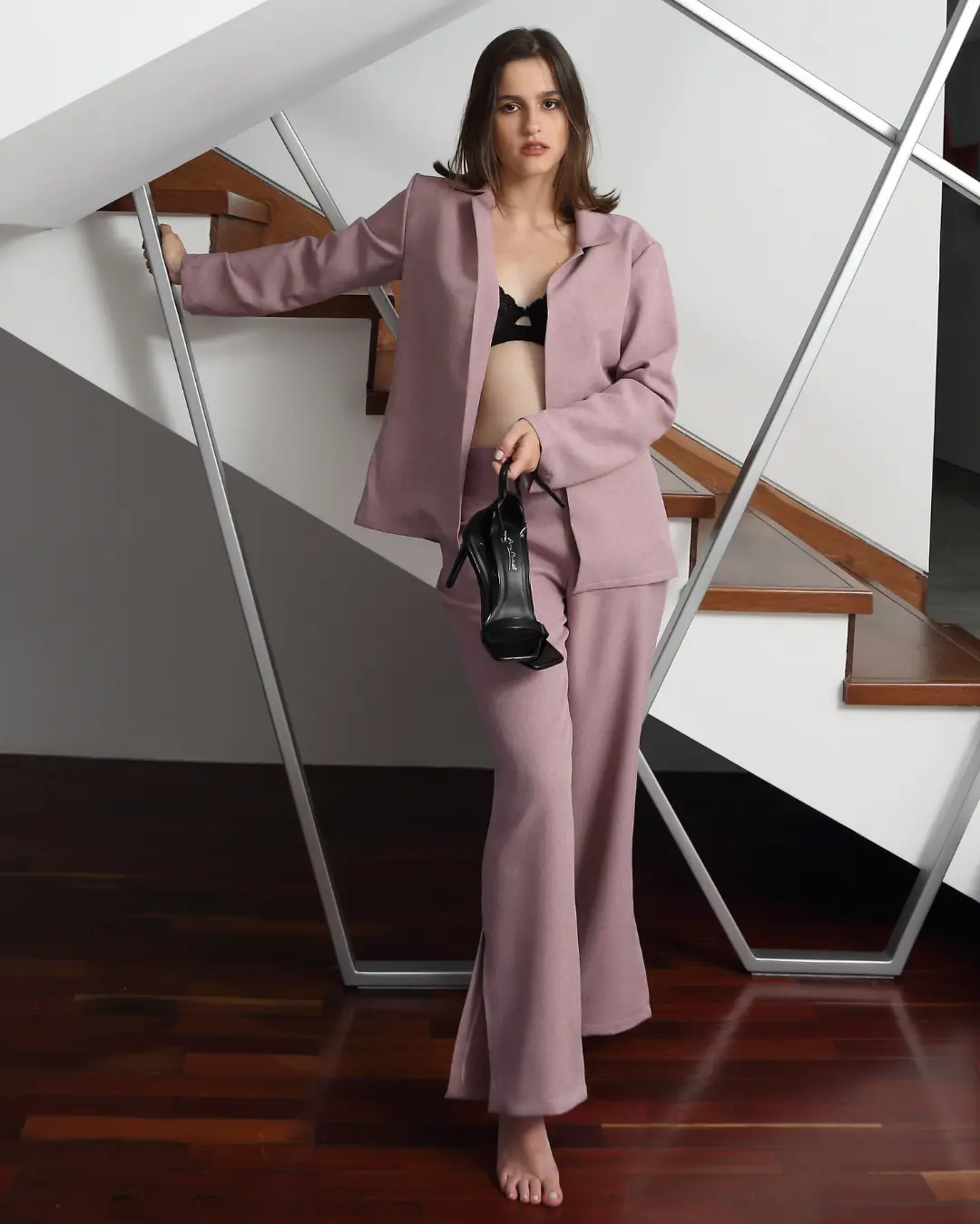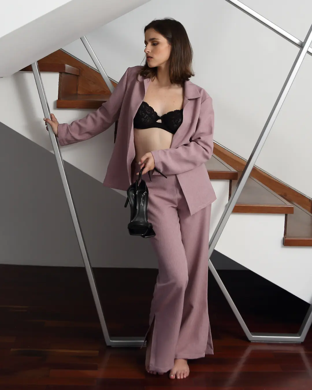 Set en tela crepé, blazer suave con una caída hermosa, combinado con un pantalón con abertura en la pierna y pinzas en la parte posterior para dar bonita forma.