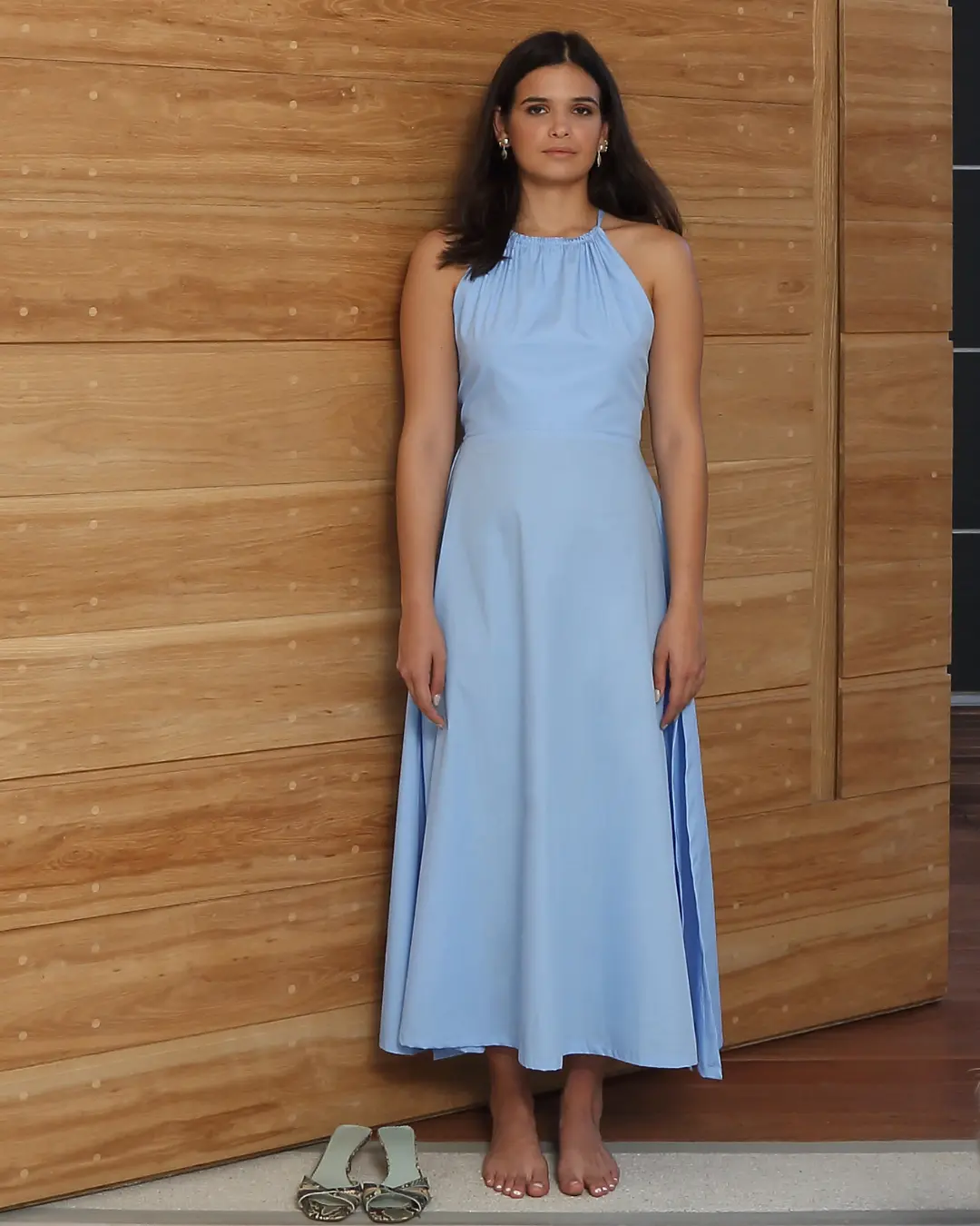 Vestido de 80-100% algodón con liga en cintura, tiras para hacer un lazo en la espalda y abertura en la pierna. Un vestido elegante, femenino, sexy y atemporal.