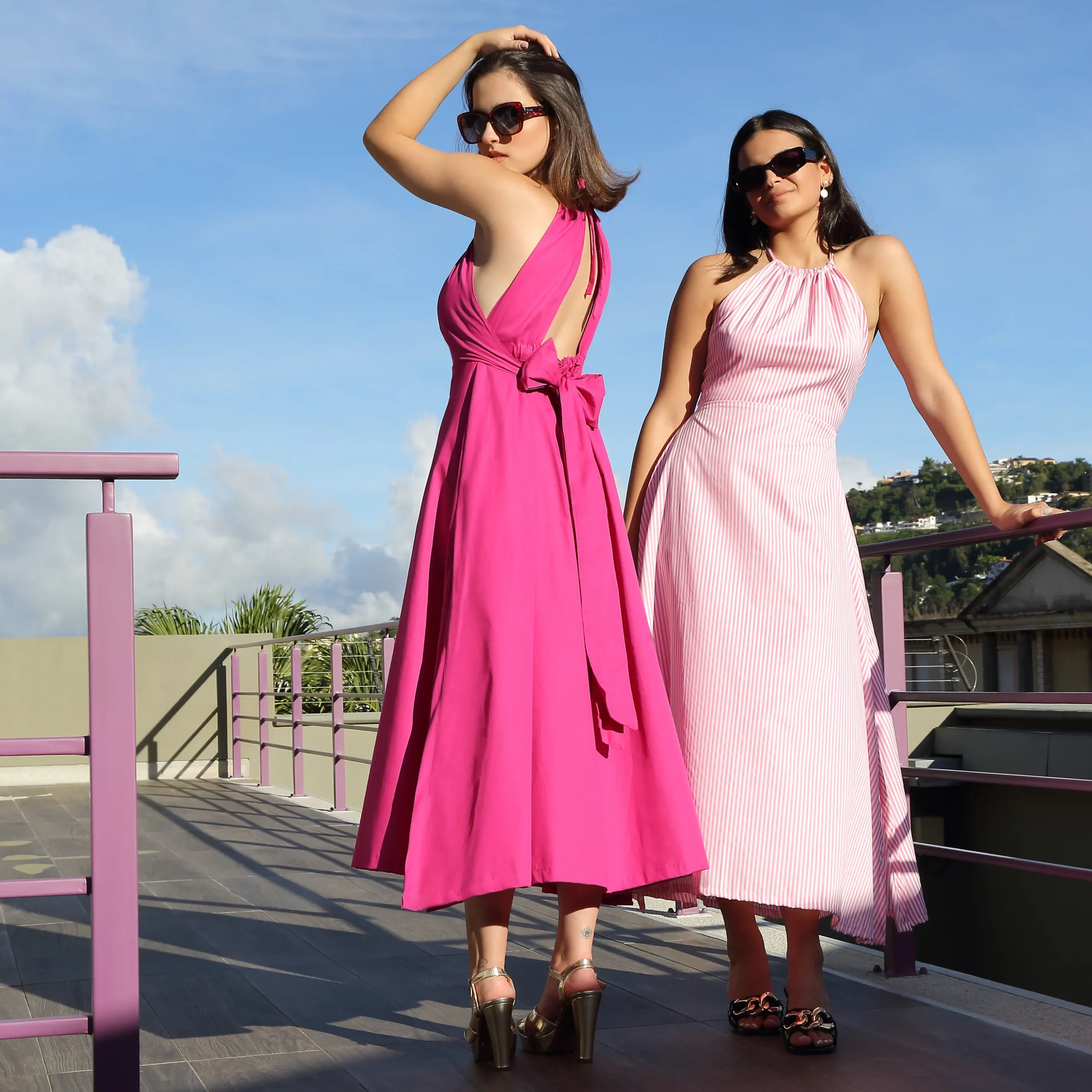 Vestido de 80-100% algodón con liga en cintura, tiras para hacer un lazo en la espalda y abertura en la pierna. Un vestido elegante, femenino, sexy y atemporal.
